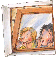 Hilfsdetektiv 001 steht mit dem Fernglas am Fenster. „Die Zwillinge sind wieder zu Hause!“, meldet er. „Und ich sehe ganz genau, dass der Junge gähnt.“